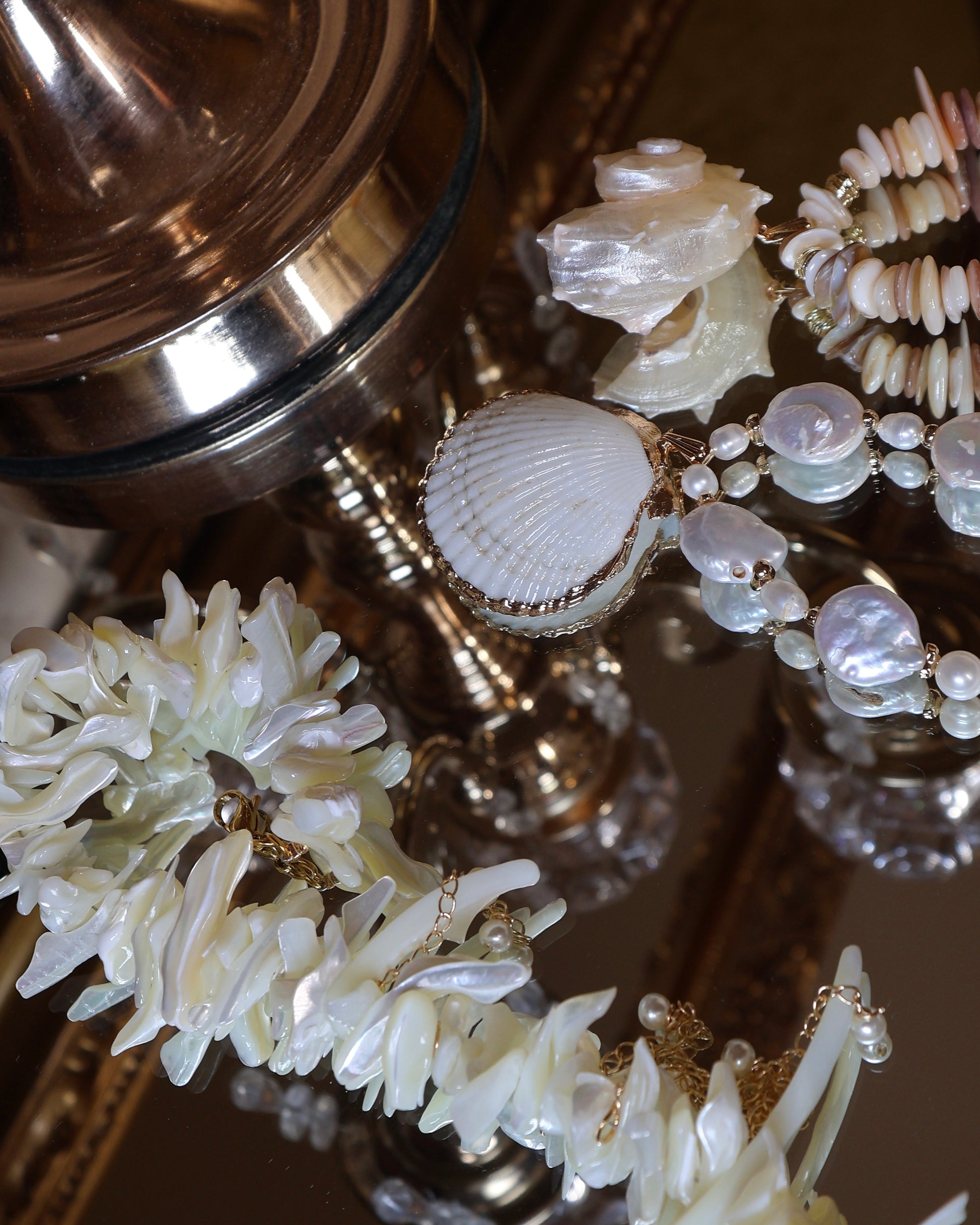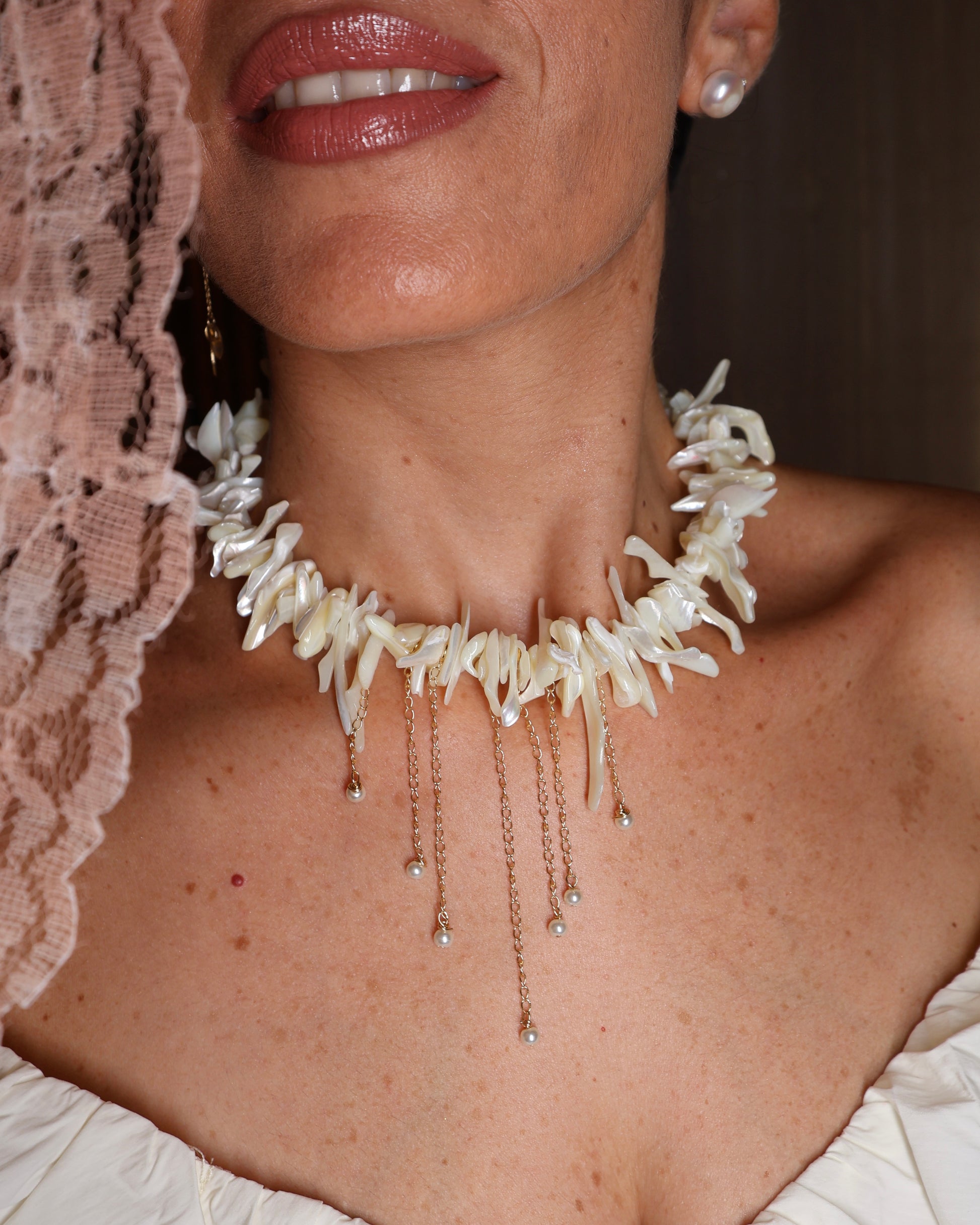 שרשרת עשויה צדפים טבעיים, ולה שרשראות זהב נופלות למראה עשיר ונוכח