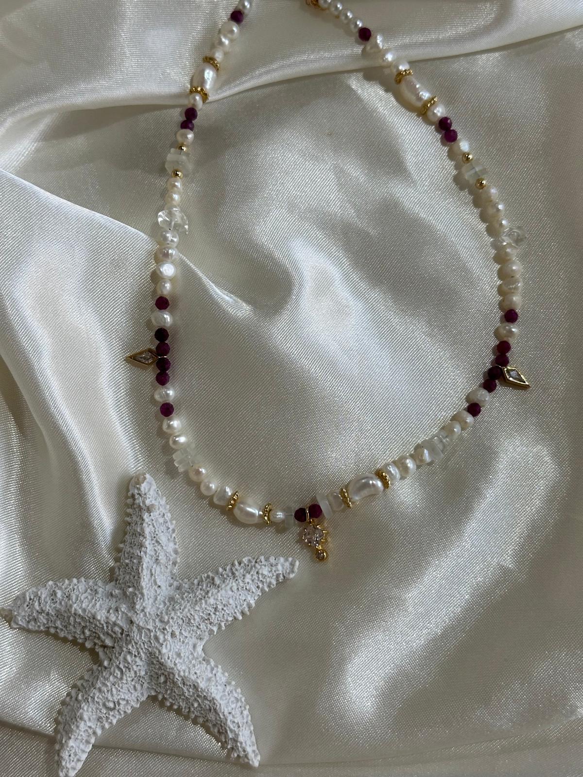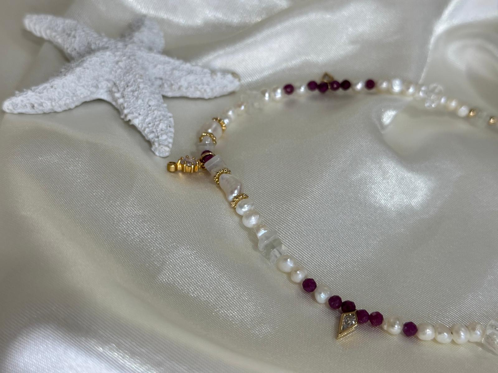 שרשרת רובי משולבת פנינים וזרקונים ציפוי זהב יכולה להשתלב עם שרשרת רובי ורודה