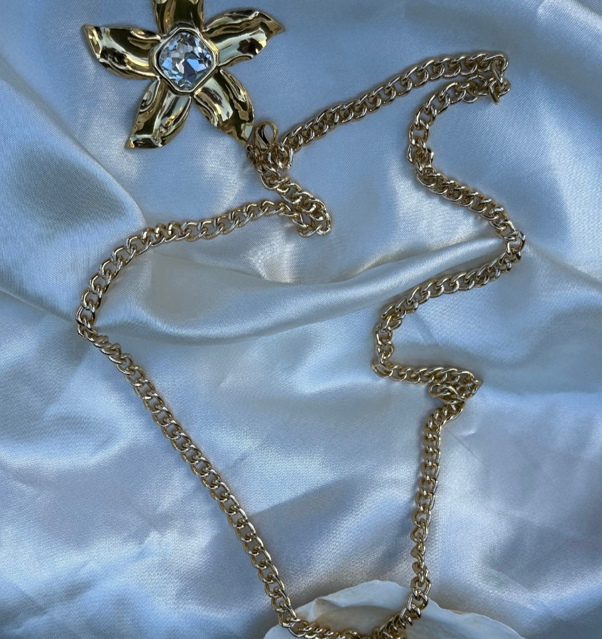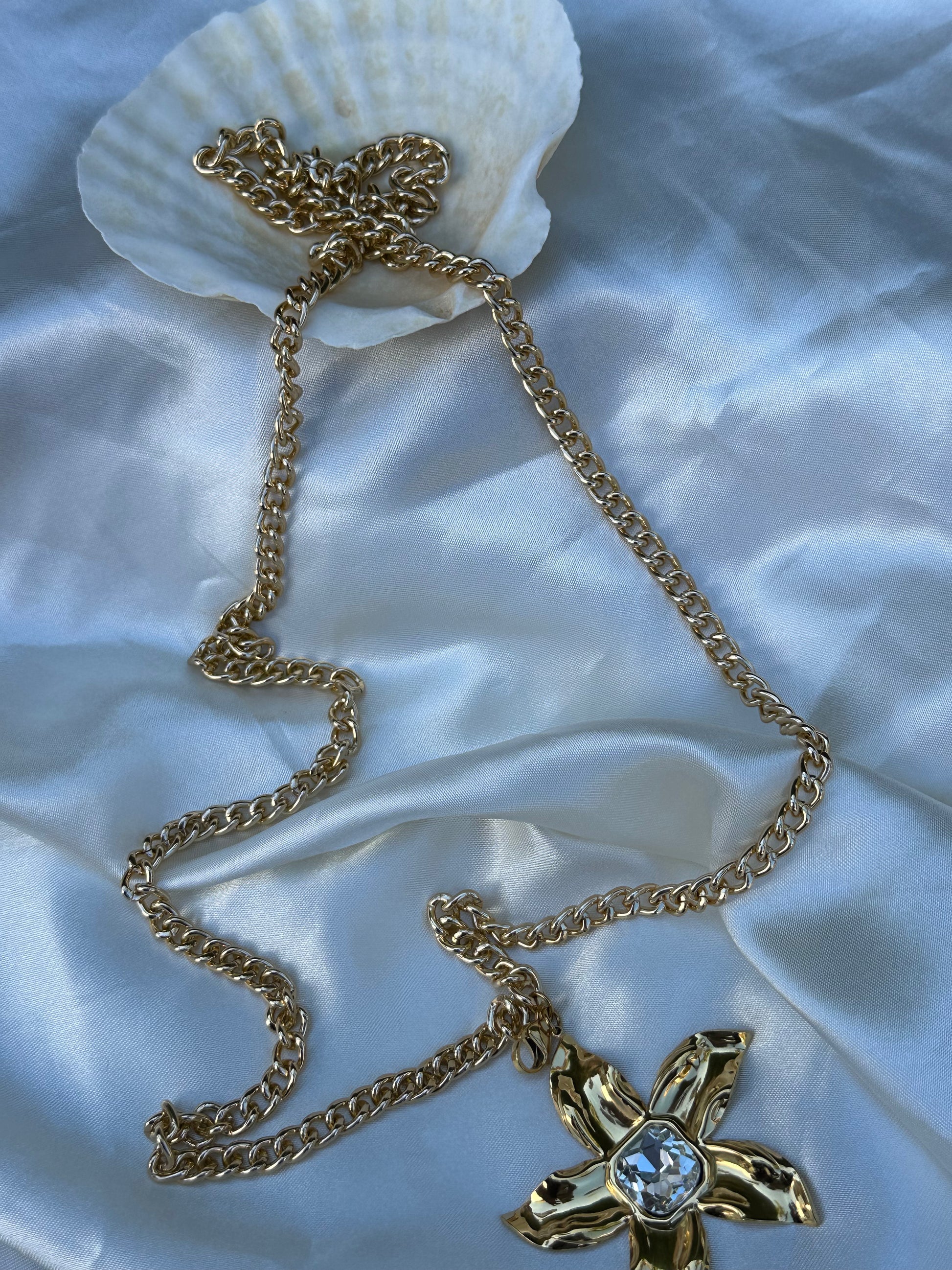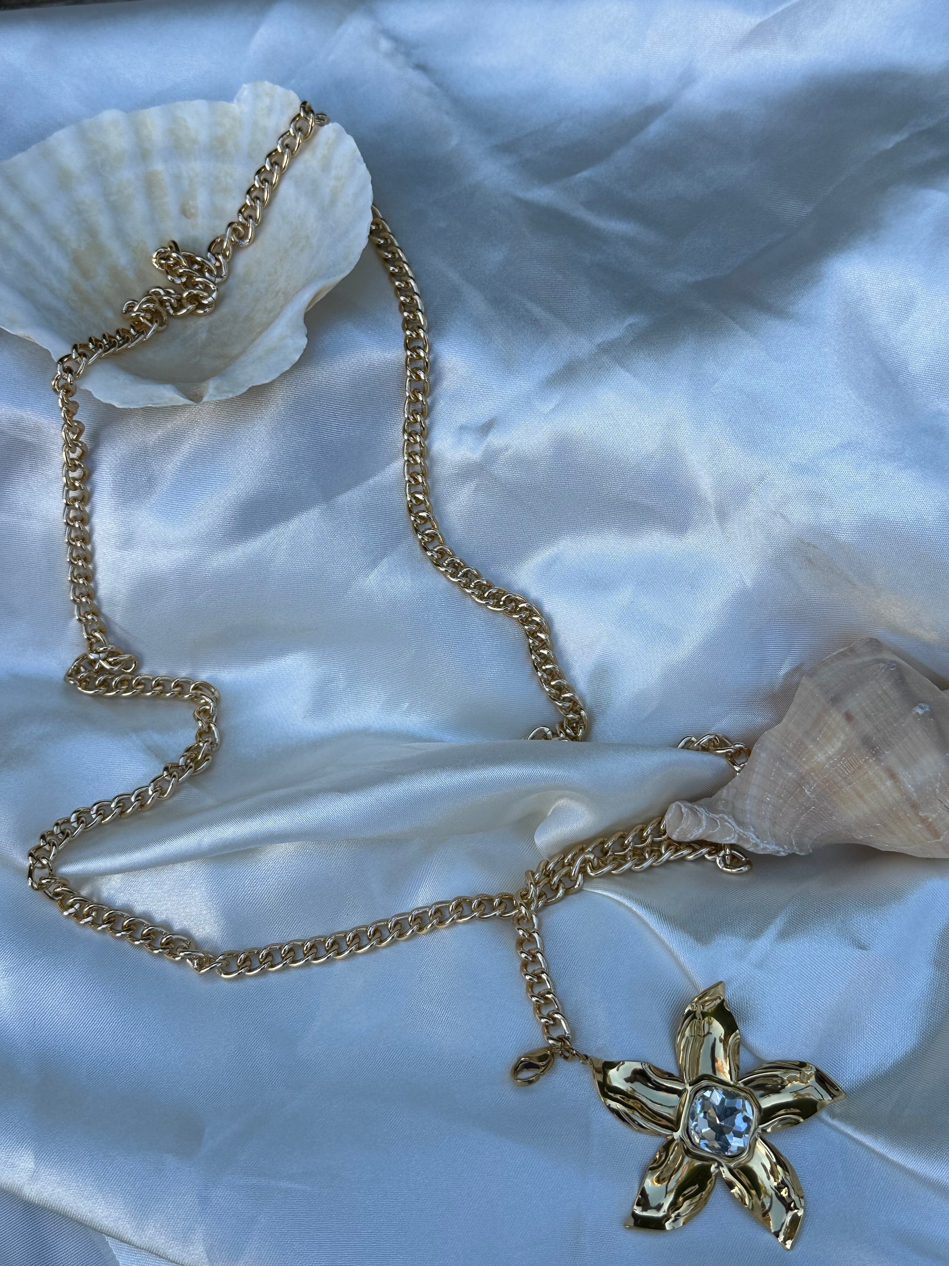 שרשרת חגורה למותן עשויה אלומיניום איכותי, בסוף השרשרת תליון פרח ענק בעל נוכחות למראה עשיר