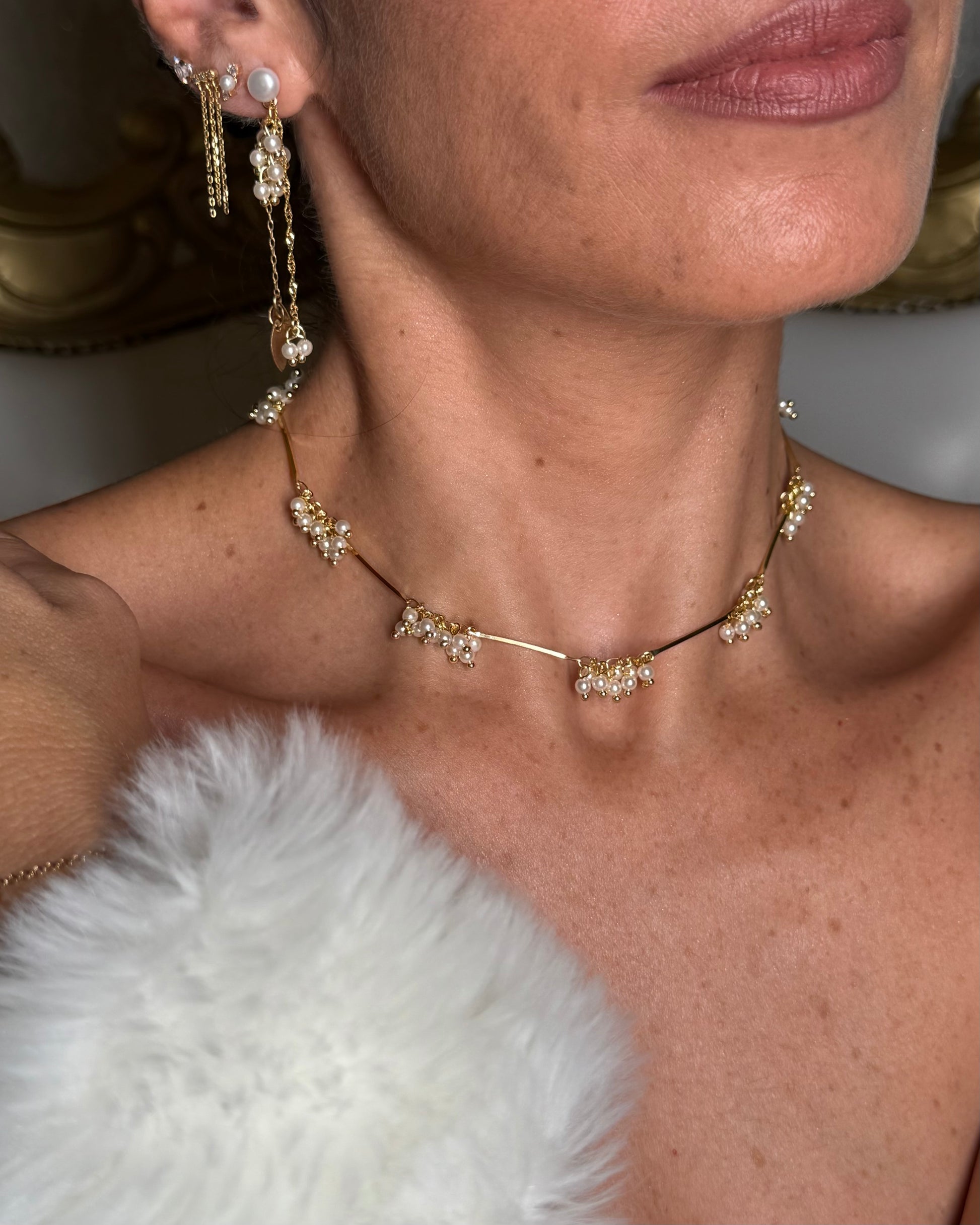 עגיל אדריאנה , עגיל פנינה צמוד לאוזן וממנו נופל אשכול פנינים קטנות ושרשרת נופלת