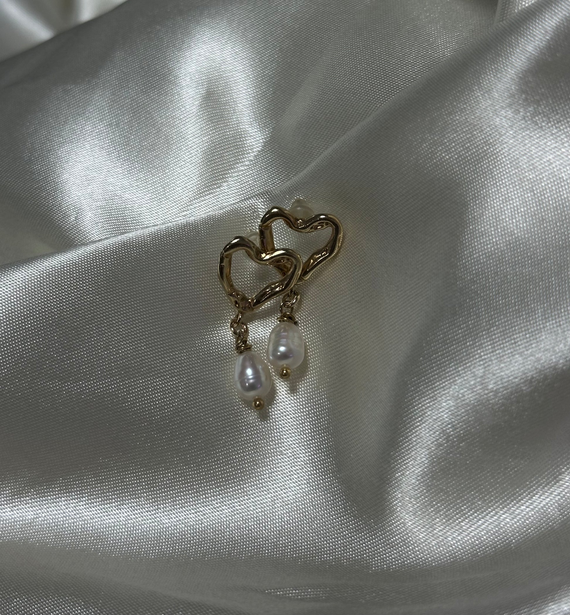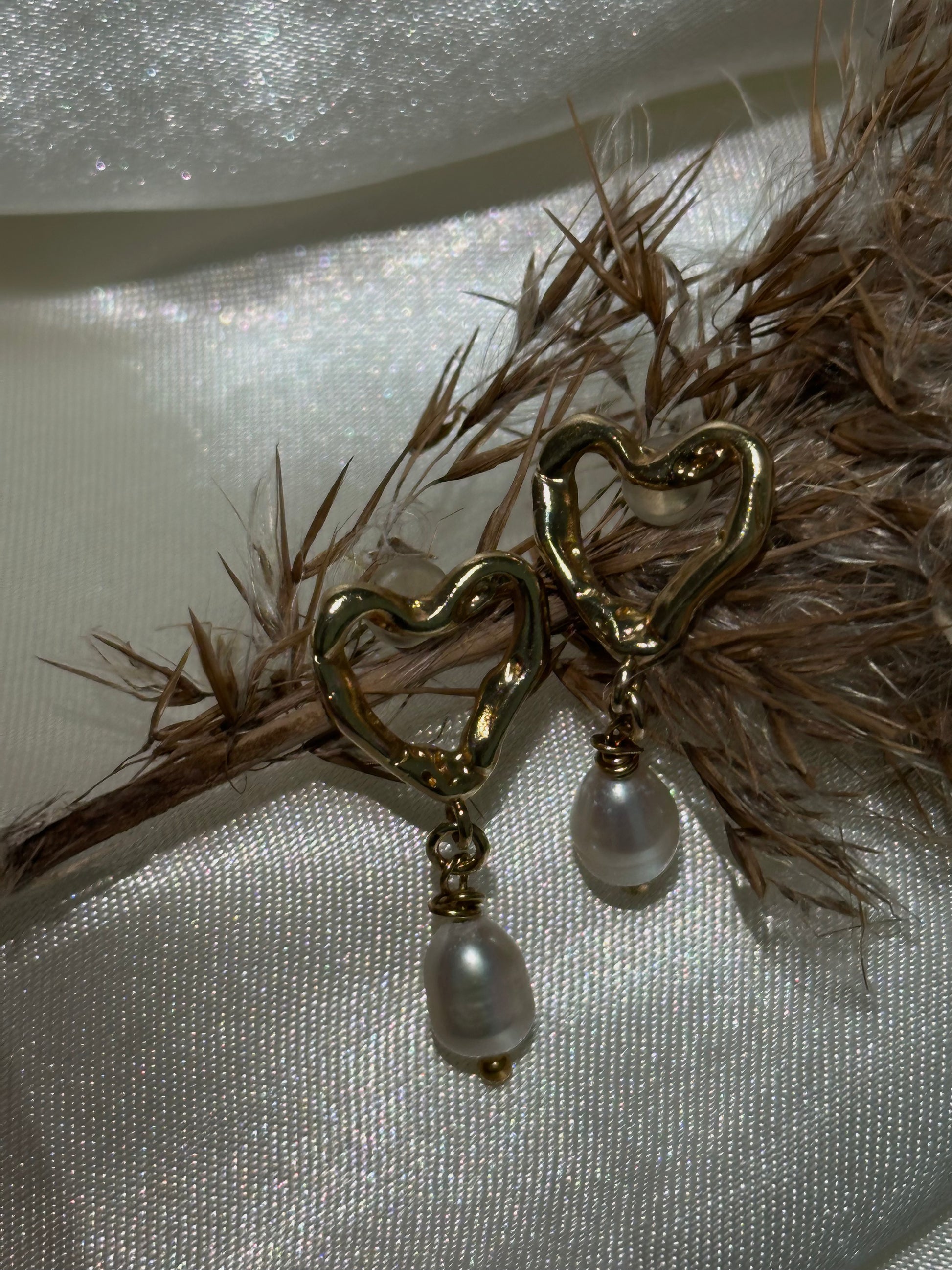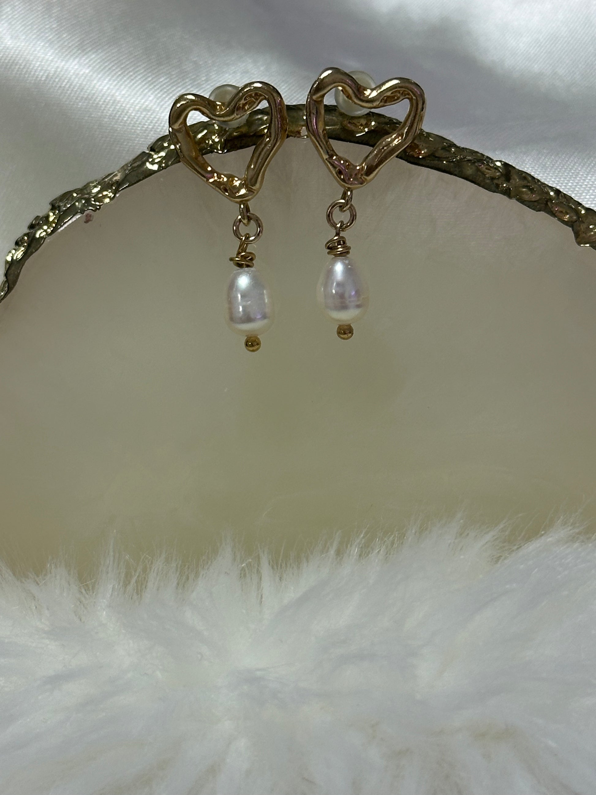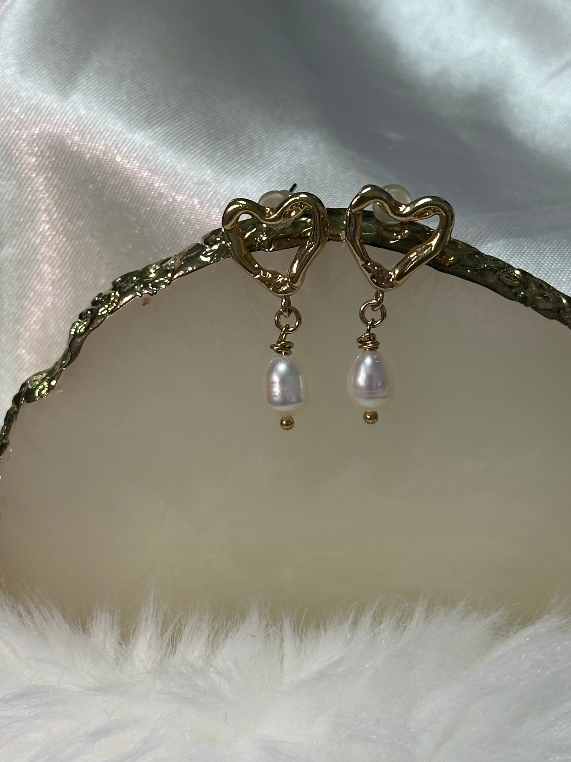 עגיל לב חלול גדול בציפוי זהב בשילוב פנינה נופלת