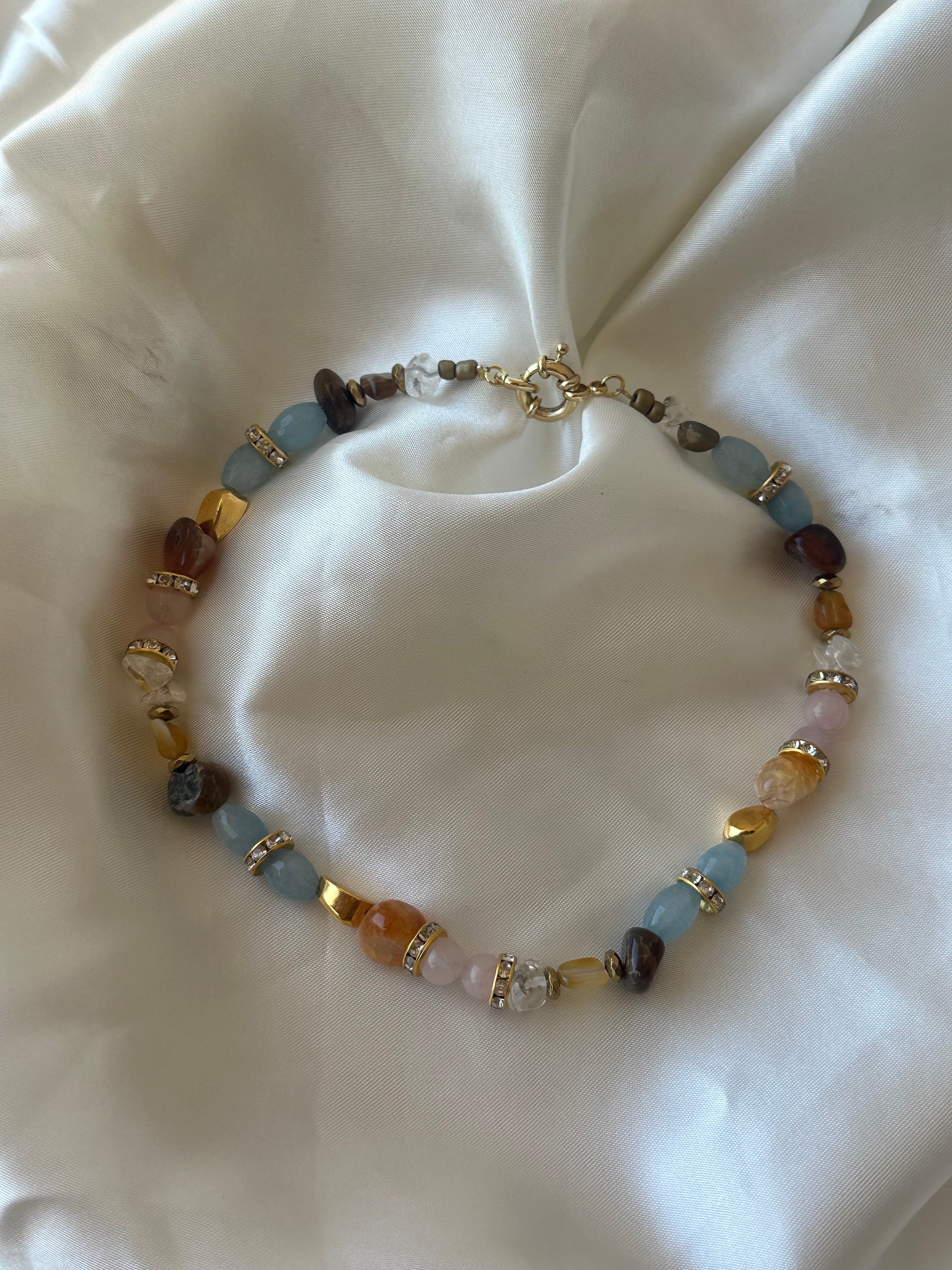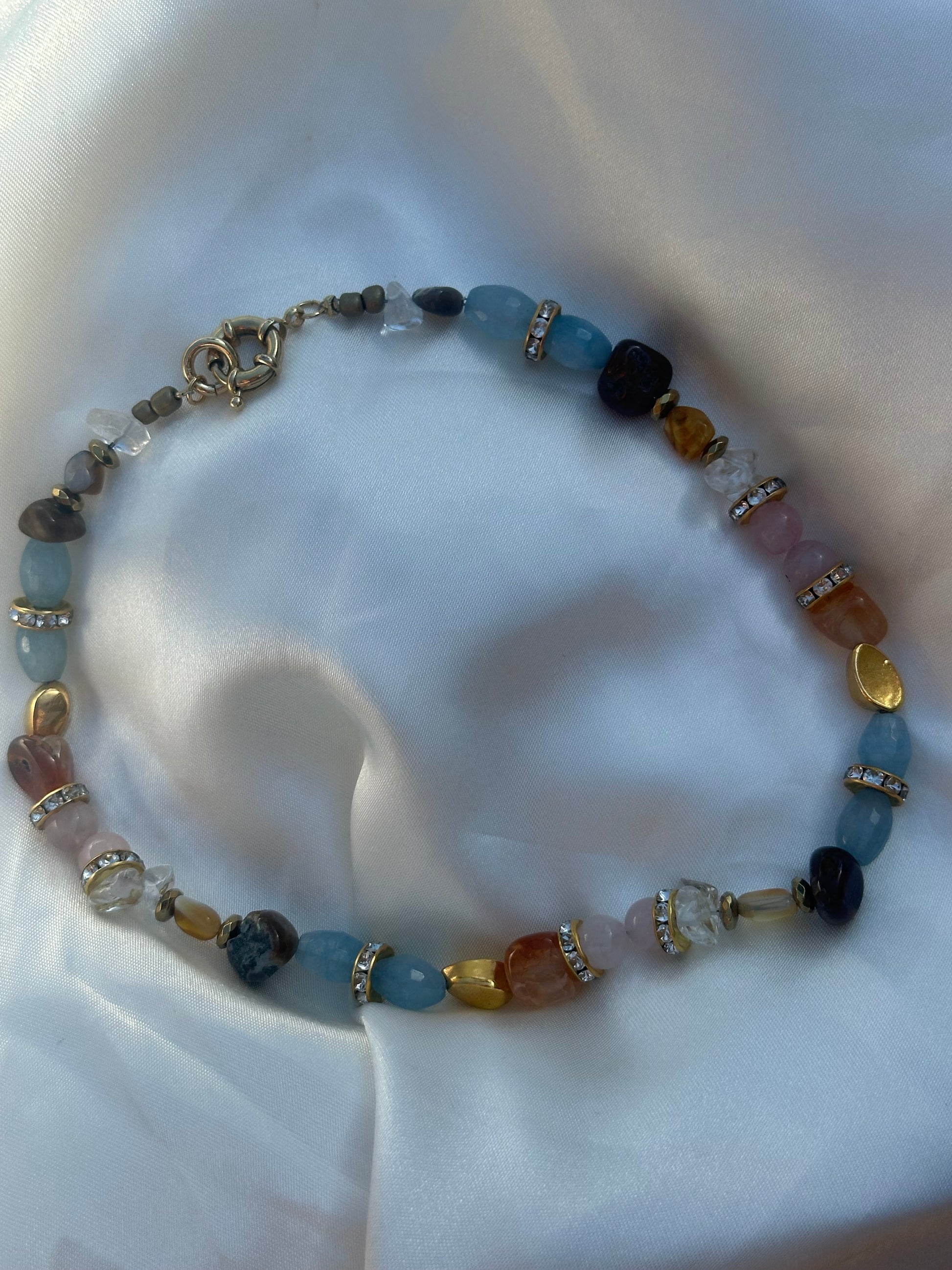שרשרת שכולה חרוזים ואבני חן דומיננטים של קיץ, שמחה ותקווה בשילוב זירקונים מצופי זהב.