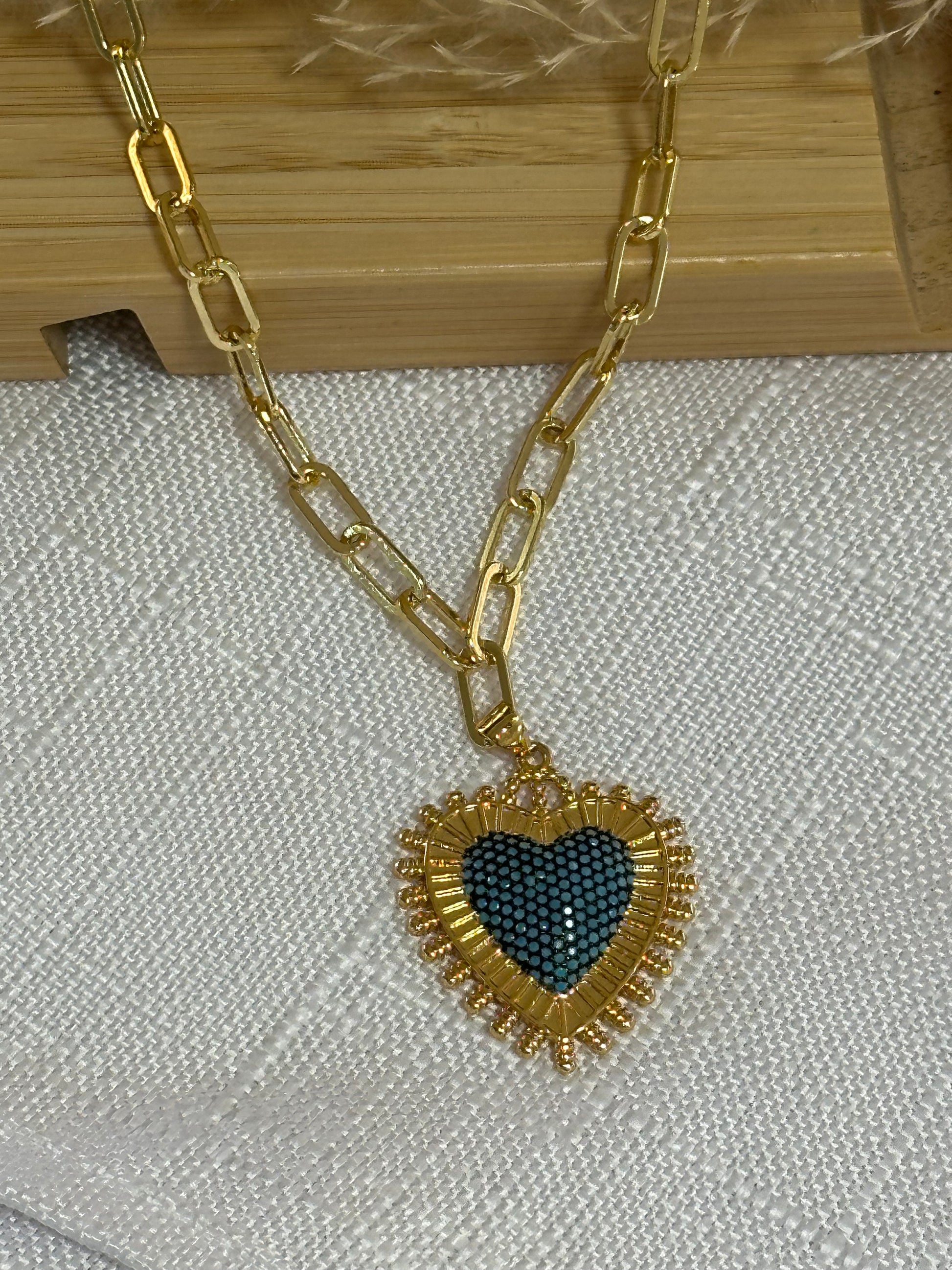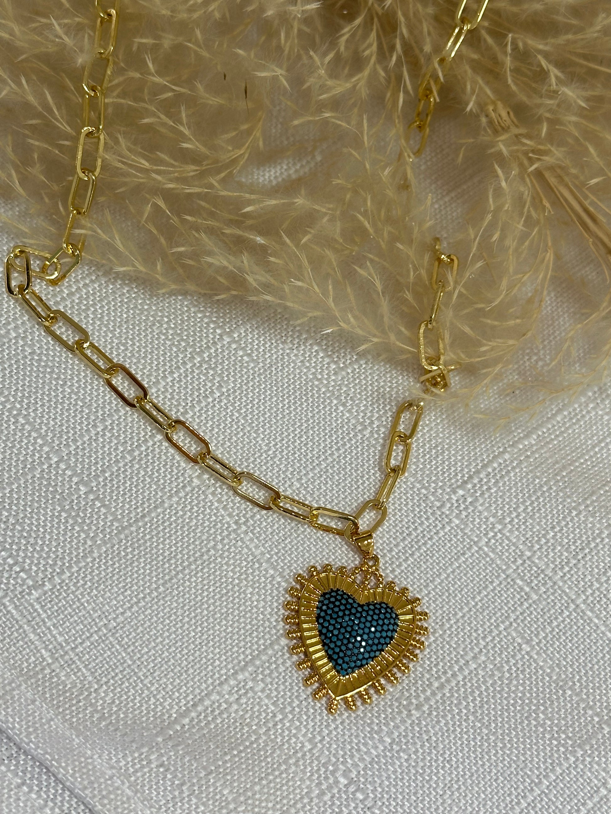 שרשרת הדיוה הגדולה, חוליות עבות עשויות ציפוי זהב, אורך השרשרת 50 ס״מ , בתוספת תליון לב פליז גדול מלא זרקונים תכלת.