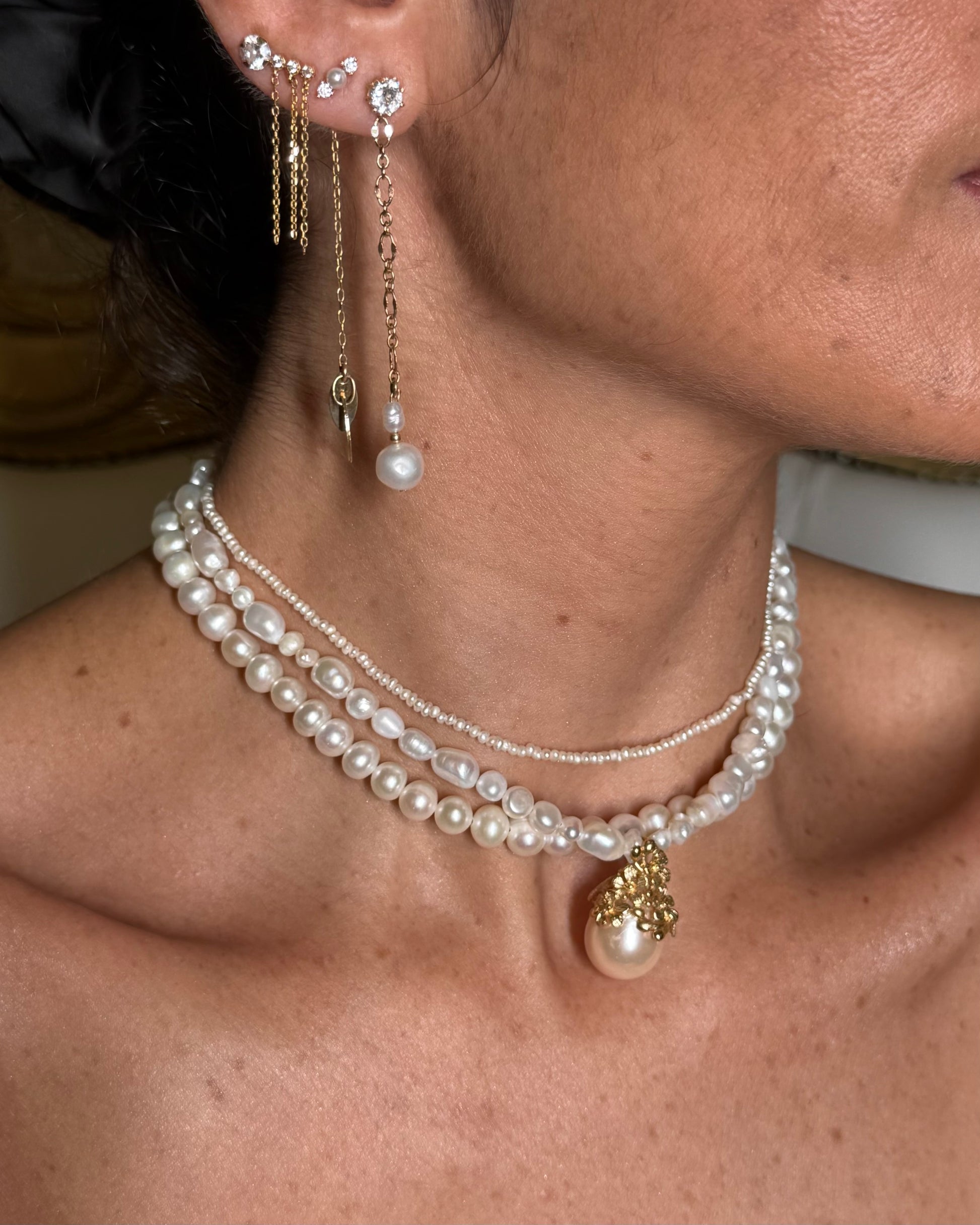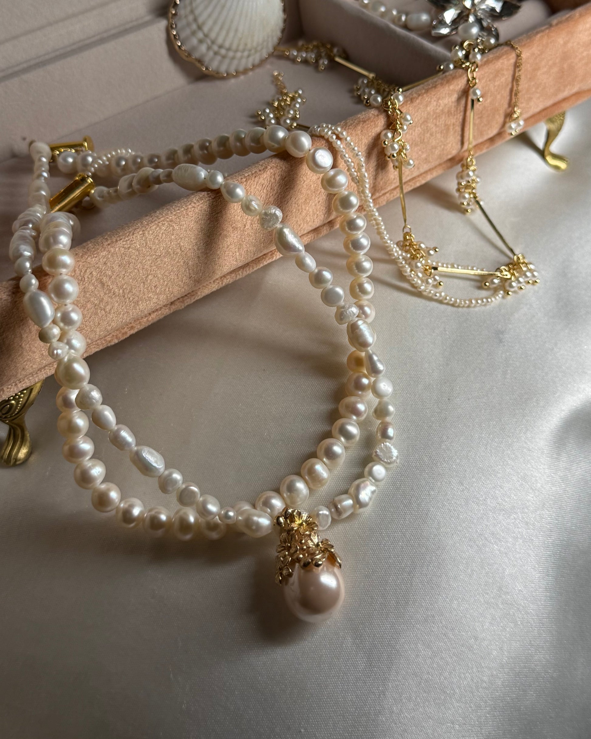 בשילוב 3 שרשראות פנינים בגדלים שונים ובמרכזה פנינה גדולה עטופה בזהב יוקרתי