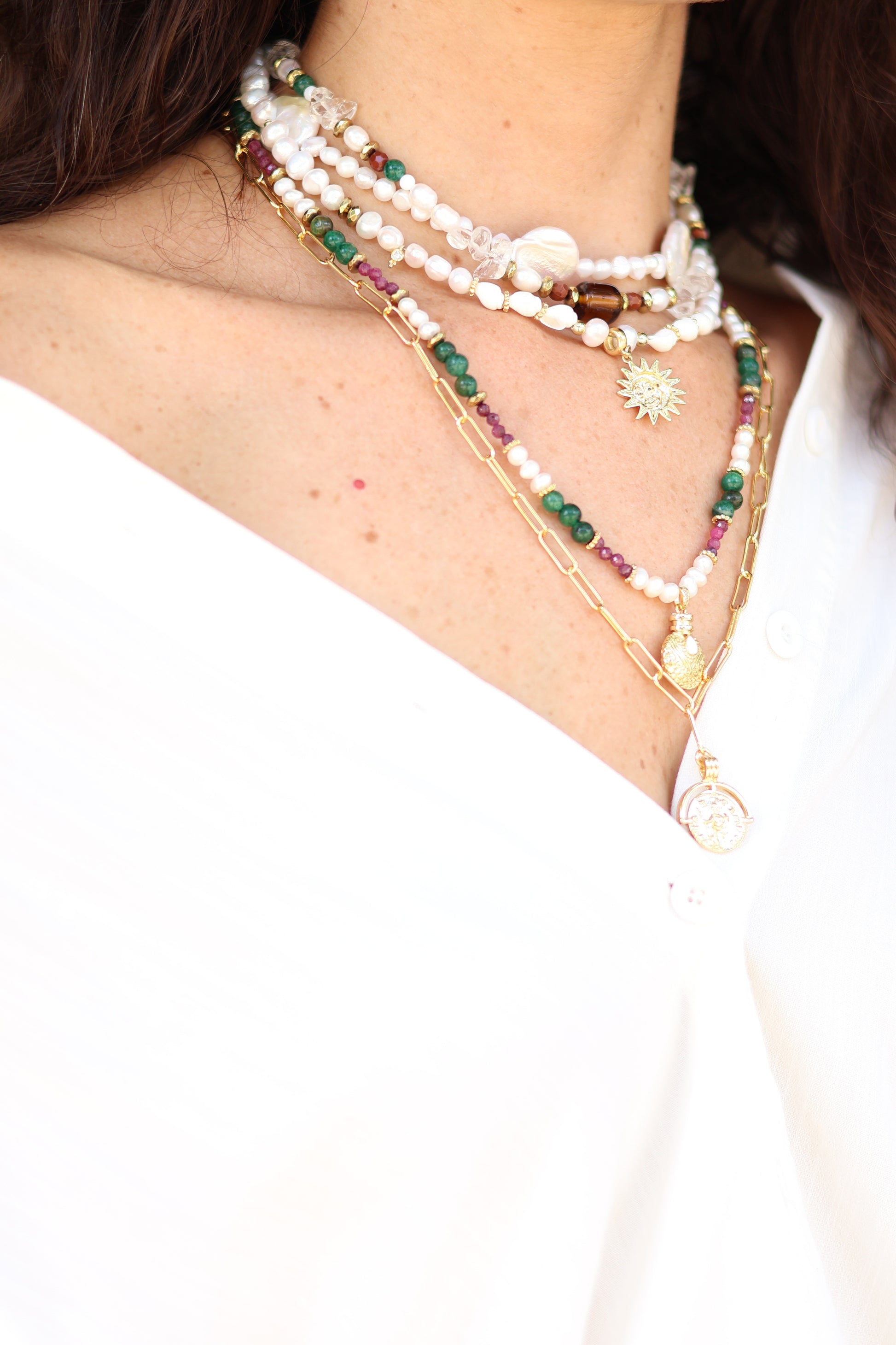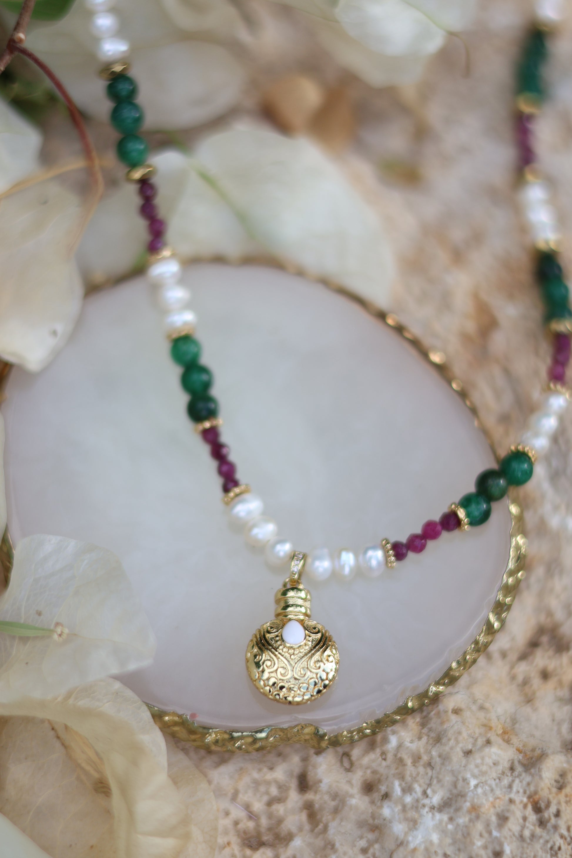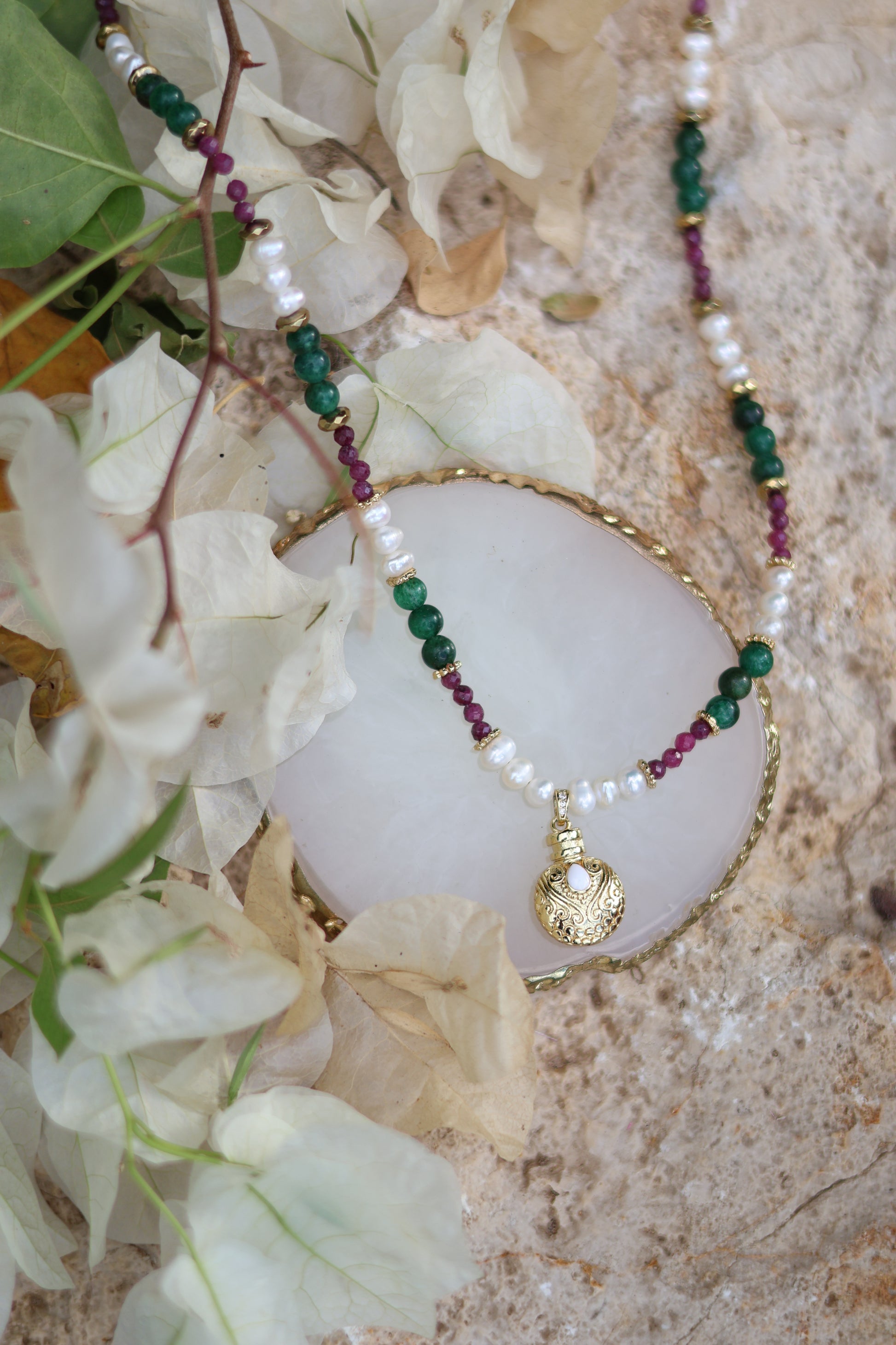 משולבת מאבני רובי , אבני אמרלד, פנינים וגולדפילד שבמרכזה תליון הודי מיוחד