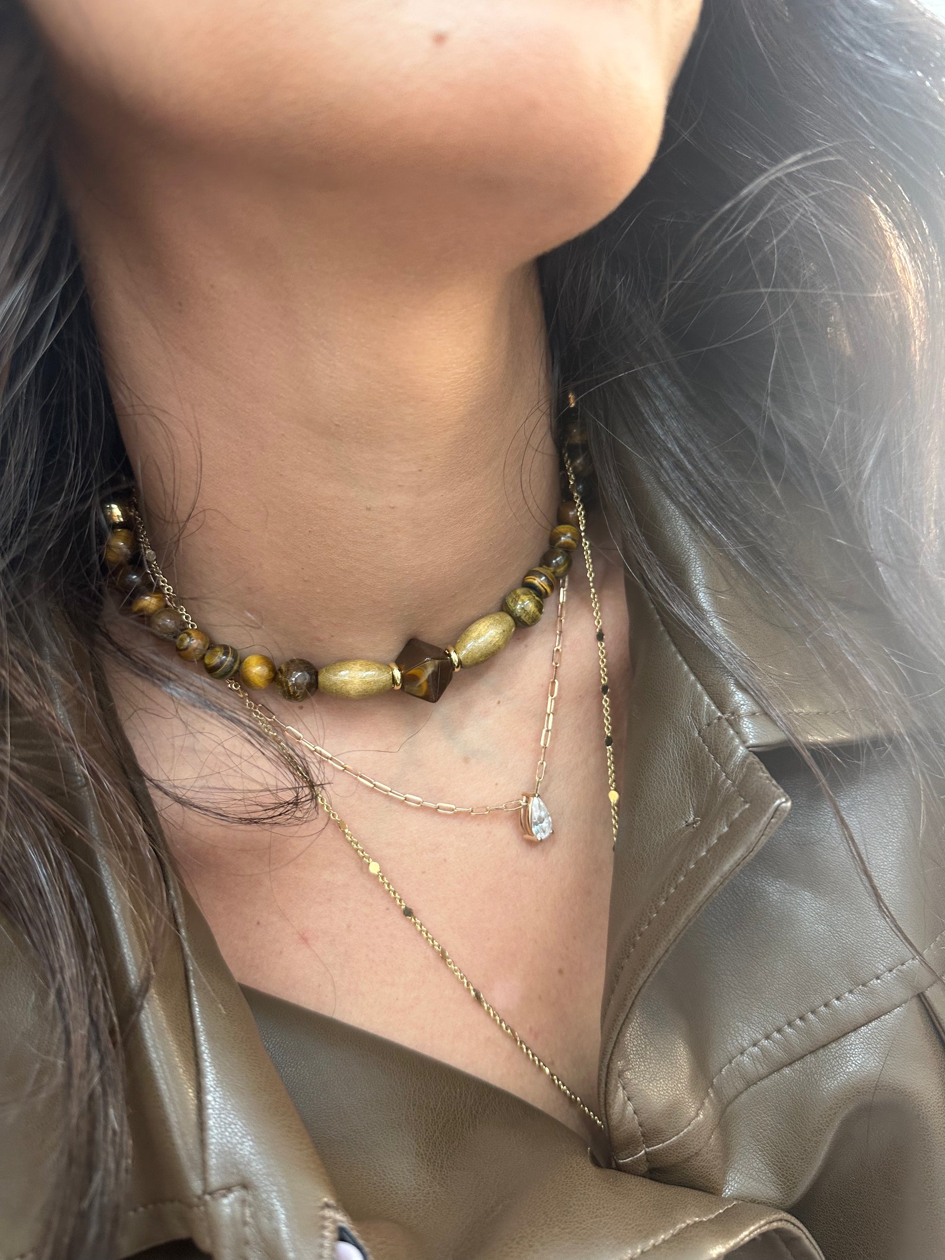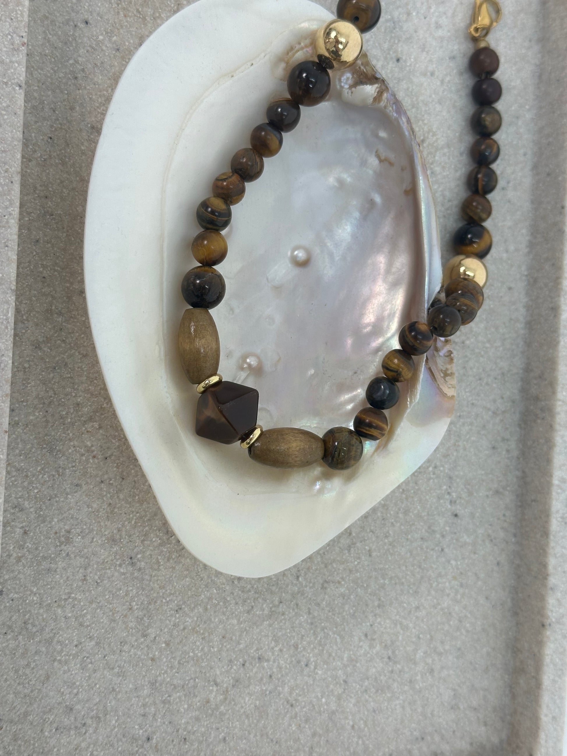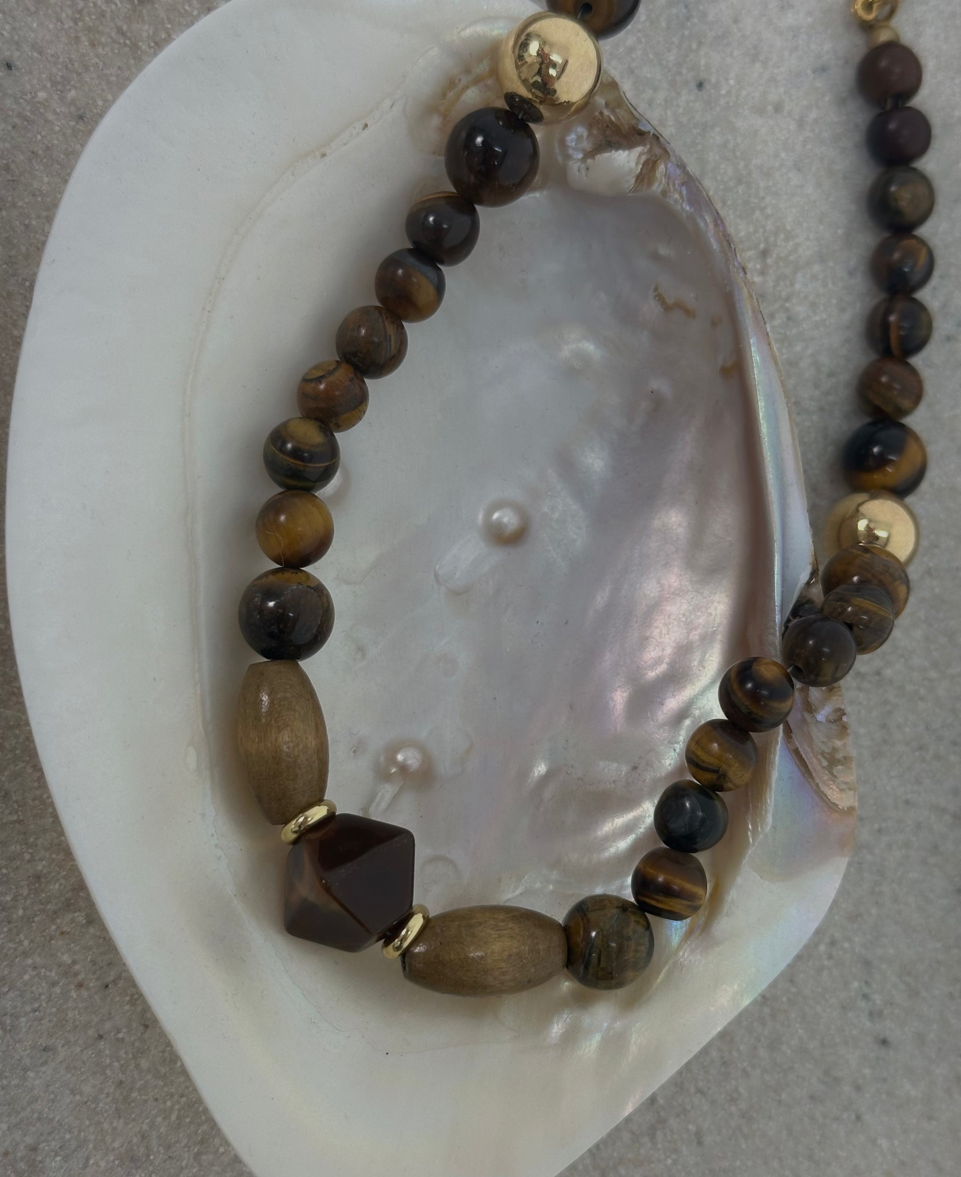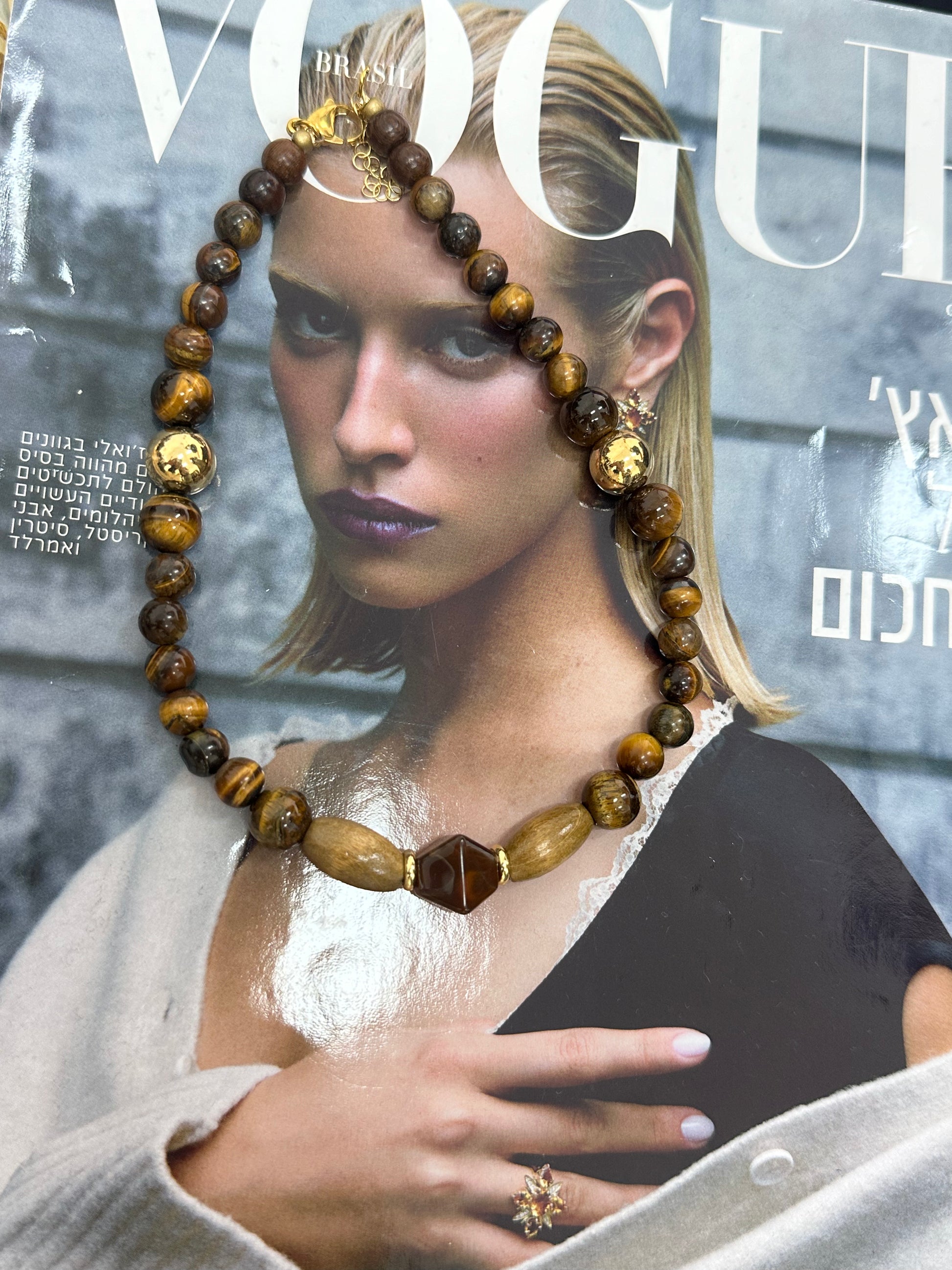 שרשרת משולבת מחרוזי עין הנמר ב-2 גדלים שונים, חרוזי עץ טבעיים וחרוזי זהב