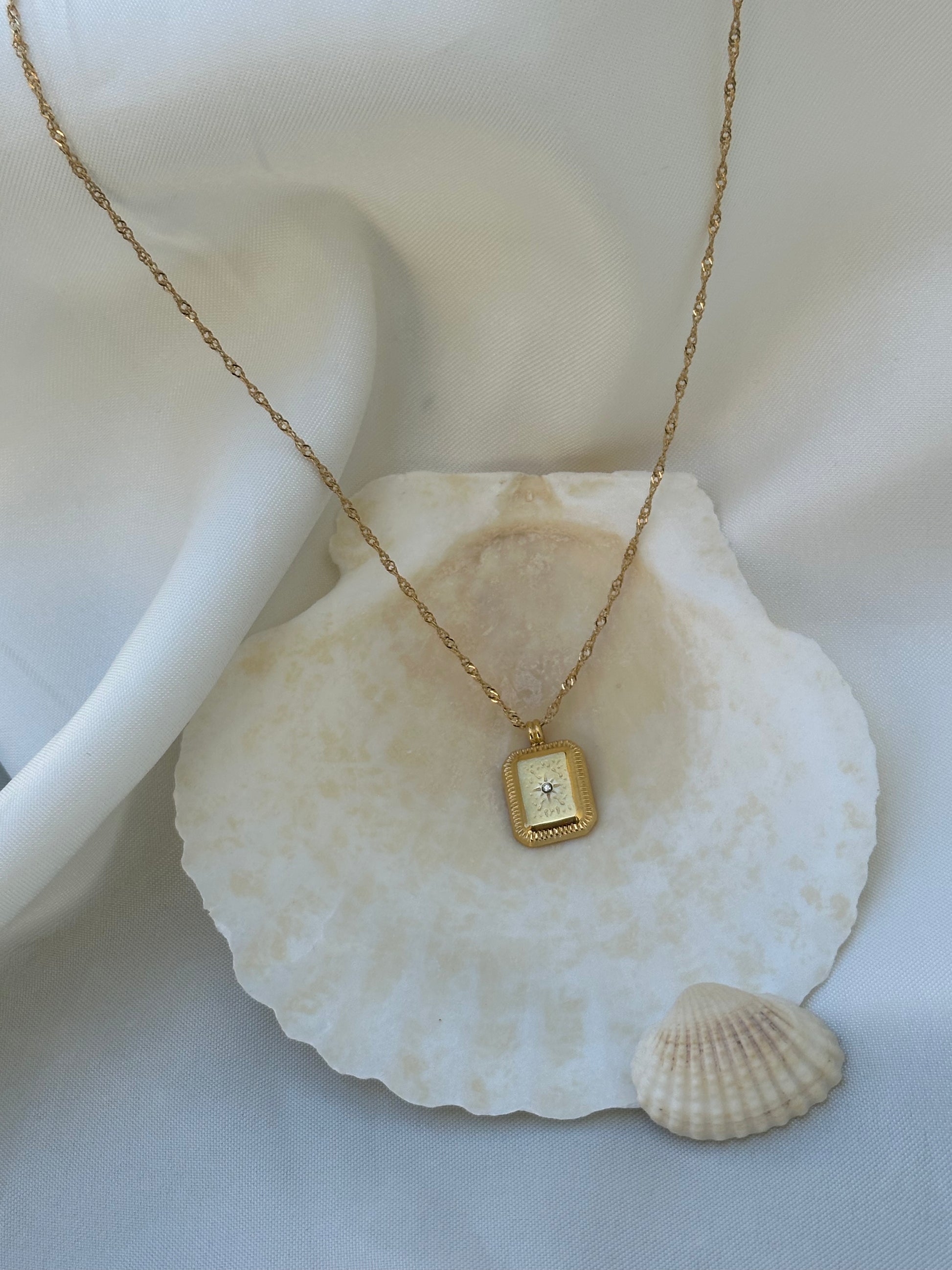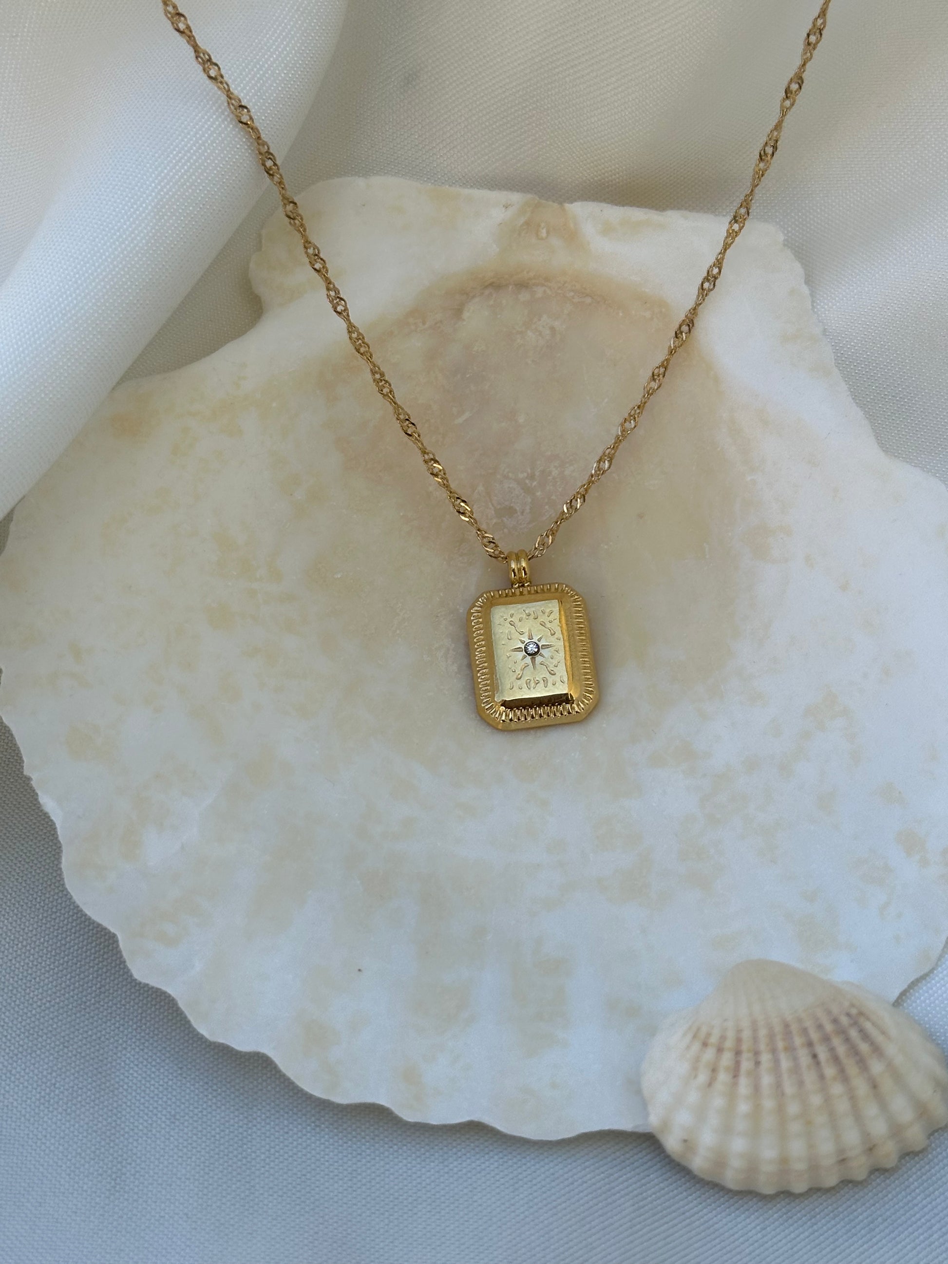 שרשרת סיני, שרשרת מסולסלת דקה ציפוי זהב בתוספת תליון מלבני קטן, עליו חרוט דמוי כוכב וזרקור באמצע